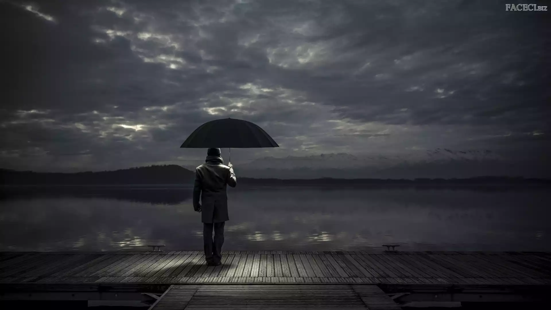 Parasol, Deszcz, Pomost, Jezioro, Mężczyzna - faceci.biz